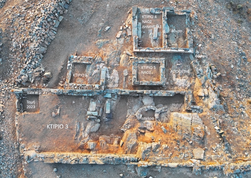 The University of Thessaly excavation at the site of Vryokastro on Kythnos and the islet of Vryokastraki began in 2002 and is ongoing, bringing to light the ancient city of Kythnos. Habitation on the acropolis was continuous from the twelfth century BC until the sixth-seventh century AD. The antiquities on Vryokastro hill are located on successive terraces. One of the most important discoveries is the unlooted sanctuary of Archaic, Classical and Hellenistic times. Its twin temple was found undisturbed, with all the precious ex-votos in situ. To the south of the temple two altars were excavated, as well as an extensive sacral deposit (apothetes) from which hundreds of valuable votive offerings were recovered. This is one of the richest deposits of finds in the Cyclades and contained vases, figurines, jewellery, tools, precious stones, seal-stones, and so on. To the west of the sanctuary was a monumental retaining wall, close to which was a public building, probably a prytaneion, of the Classical-Hellenistic period. Excavated on the Upper Terrace of the hill was a complex of public buildings of Classical-Hellenistic times, which are identified with sanctuaries of Asklepios, the Samothracian Gods and Aphrodite, as well as a bottle-shaped cistern 7.5 m deep, inside which many vases had been discarded, as well as marble statues.