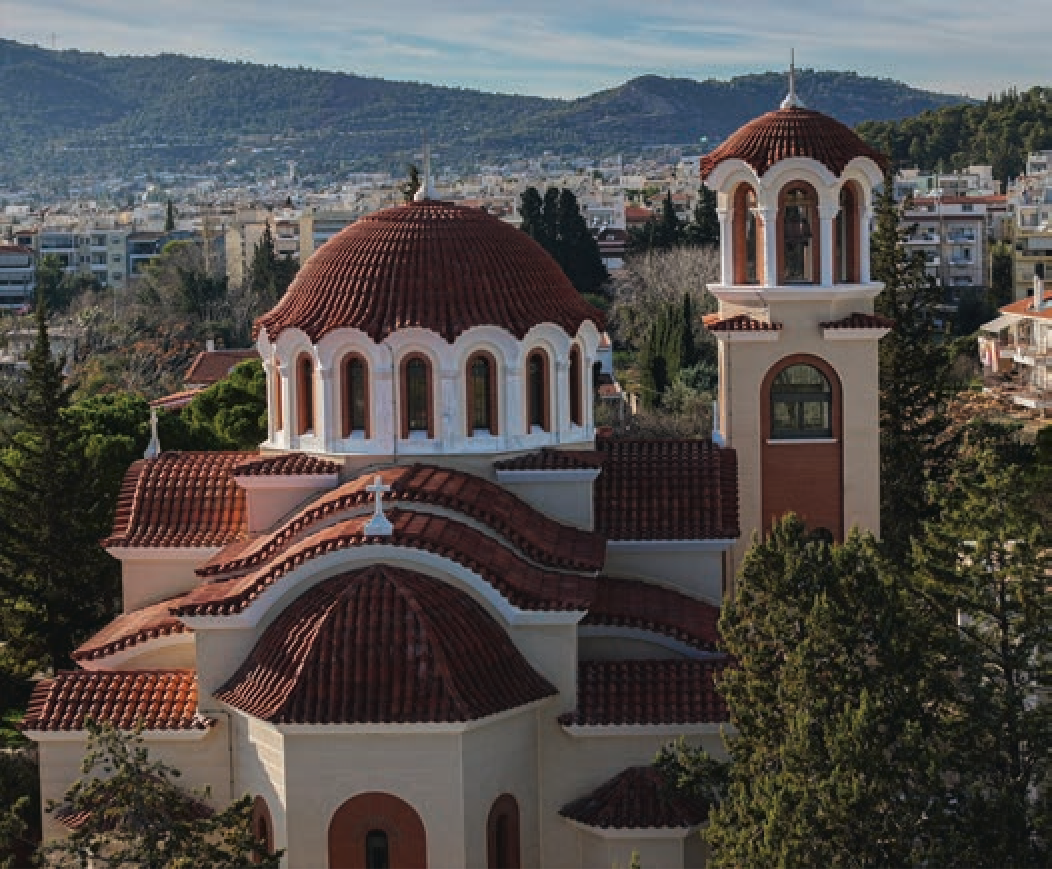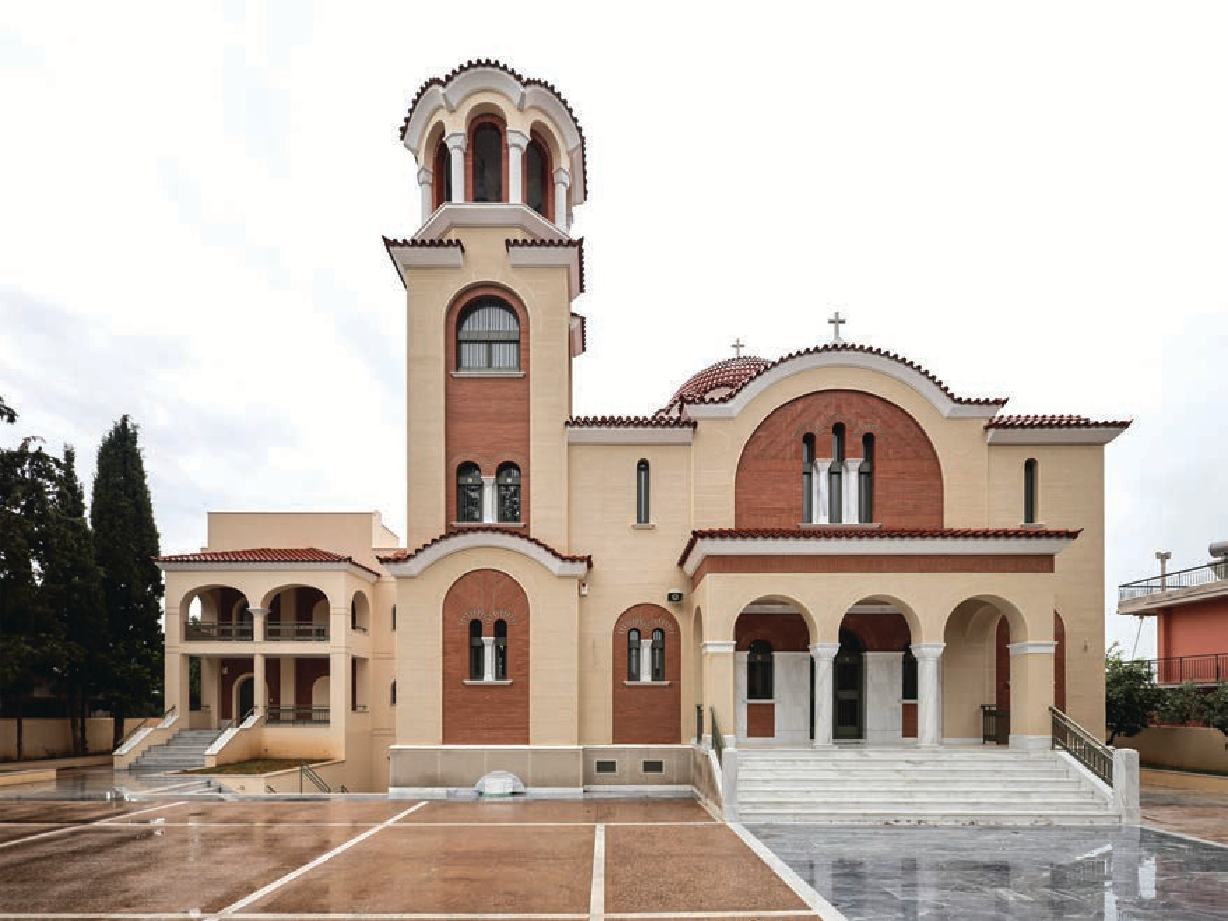Η διαμόρφωση των όψεων του ναού έγινε με έγχρωμο θραπιναριστό επίχρισμα «αρτιφισιέλ» με εμφανείς αρμούς δόμων σε συνδυασμό αφενός με το εμφανές τούβλο με οριζόντιους αρμούς στα τύμπανα πλήρωσης και τα λευκά μάρμαρα Διονύσου στους κιονίσκους, τις ποδιές και τις επενδύσεις στις εσωτερικές όψεις των στοών και τα δάπεδα.