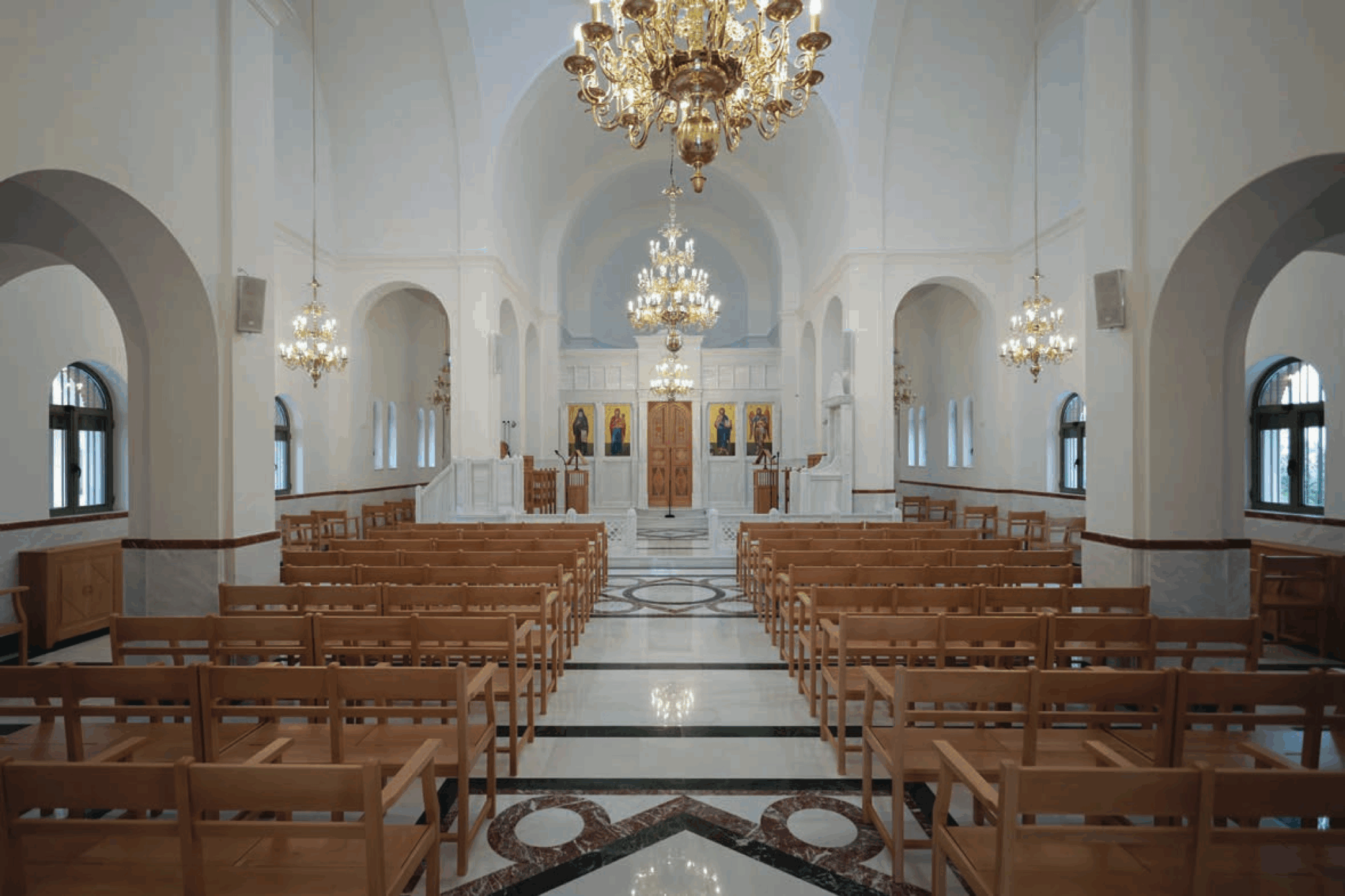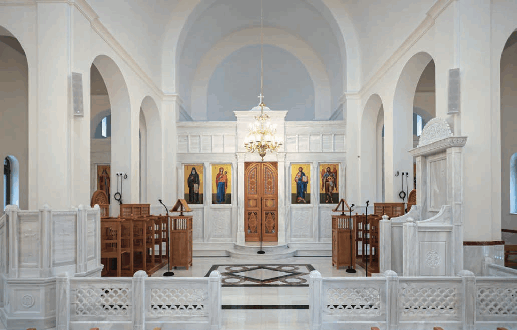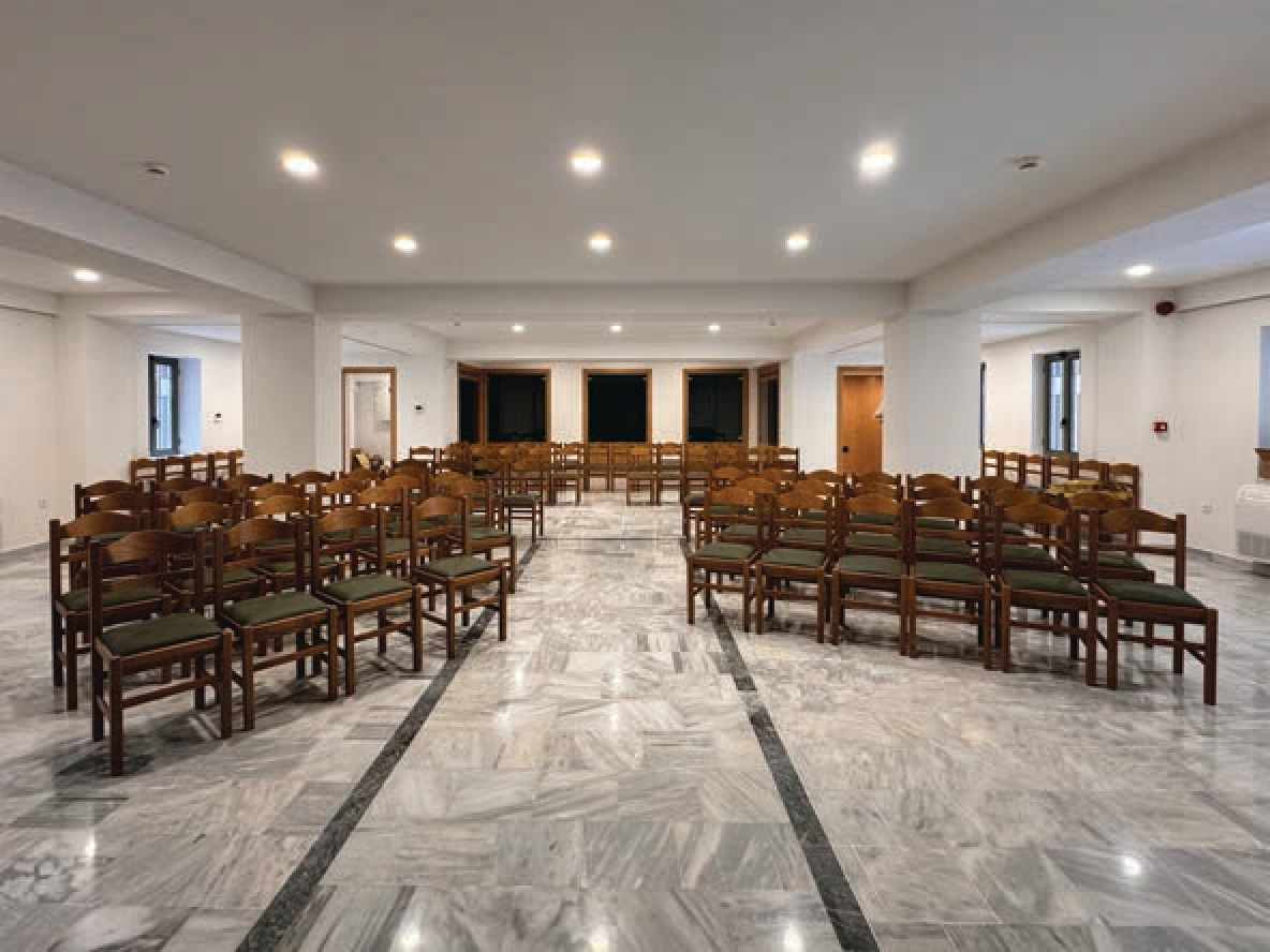 Στον ναό, στο παρεκκλήσιο του υπογείου και στο παρεκκλήσιο του ξενώνα μελετήθηκαν και κατασκευάστηκαν τα γλυπτά μαρμάρινα στοιχεία (τέμπλο, άμβωνας, θωράκια σολέα, Άγιες Τράπεζες δεσποτικός θρόνος, κηροστάτης), ο ξυλόγλυπτος εξοπλισμός (βημόθυρα ναού, τέμπλο παρεκκλησίου, θωράκια παρεκκλησίου, στασίδια σολέα & παρεκκλησίου, προσκυνητάρια, παγκάρια), καθώς και η σταθερή και κινητή επίπλωση του συνόλου του συγκροτήματος.