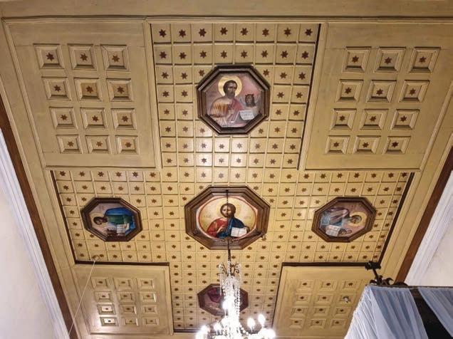 Η ξύλινη οροφή φέρει πέντε οκταγωνικά πλαίσια (ταμπλάδες) με ζωγραφικές παραστάσεις του Παντοκράτορα και των Ευαγγελιστών, οι οποίες δημιουργήθηκαν την περίοδο 1959-1961 από τον Αγιορείτη μοναχό Ευγένιο Ραλλίδη.